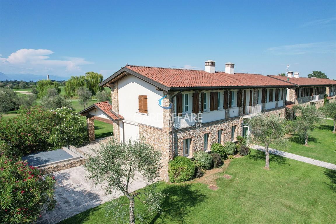 FÜR GOLF-ENTHUSIASTEN ODER AUCH NICHT, bieten wir eine GROSSE DREI-ZIMMER-WOHNUNG IM ERDGESCHOSS im bezaubernden Resort des Chervò Golf Hotel Spa & Resort San Vigilio an. Zwischen Desenzano und Sirmione, im unmittelbaren Hinterland der Moränenhügel, sehr günstig gelegen hinsichtlich der Erreichbarkeit nur 10 Minuten von der Autobahnabfahrt und nur einen Steinwurf vom Gardasee entfernt, befindet sich diese voll ausgestattete DREI-ZIMMER-WOHNUNG innerhalb eines Vierfamilienhauses. Die Wohnung besteht aus einem großen Wohnzimmer mit Küchenzeile und Essbereich, der zu einer wunderschönen großen Veranda führt, einem Schlafzimmer/Gästezimmer, einem Ankleidezimmer und einem Badezimmer mit Fenster, sowie einem Masterschlafzimmer mit Doppelbett und privatem Bad. Geräumiger Portico mit großem privaten Außenbereich. Doppelgarage im Untergeschoss. Alle Räume zeichnen sich durch hochwertige Oberflächen wie Stein, Marmor und gebürstetes, geöltes Eichenholz aus. Zur Wohnung gehört eine Garage im Untergeschoss in unmittelbarer Nähe. Im Resort mit 36-Loch-Golfplatz und Driving Range befinden sich ein Restaurant, Bar mit Panoramaterrasse über den Golfplatz, ein schöner Bionatura-Pool mit Bar, Sportzentrum mit Tennis, Fußball und Beachvolleyball sowie ein Wellnesszentrum mit beheiztem Innenpool, verschiedenen Saunen und Beautybereich. Energieklasse "A". Angestrebter Verkaufspreis 650.000 Euro. GARDAFFARE 030/9905461. Ref. 22-33.