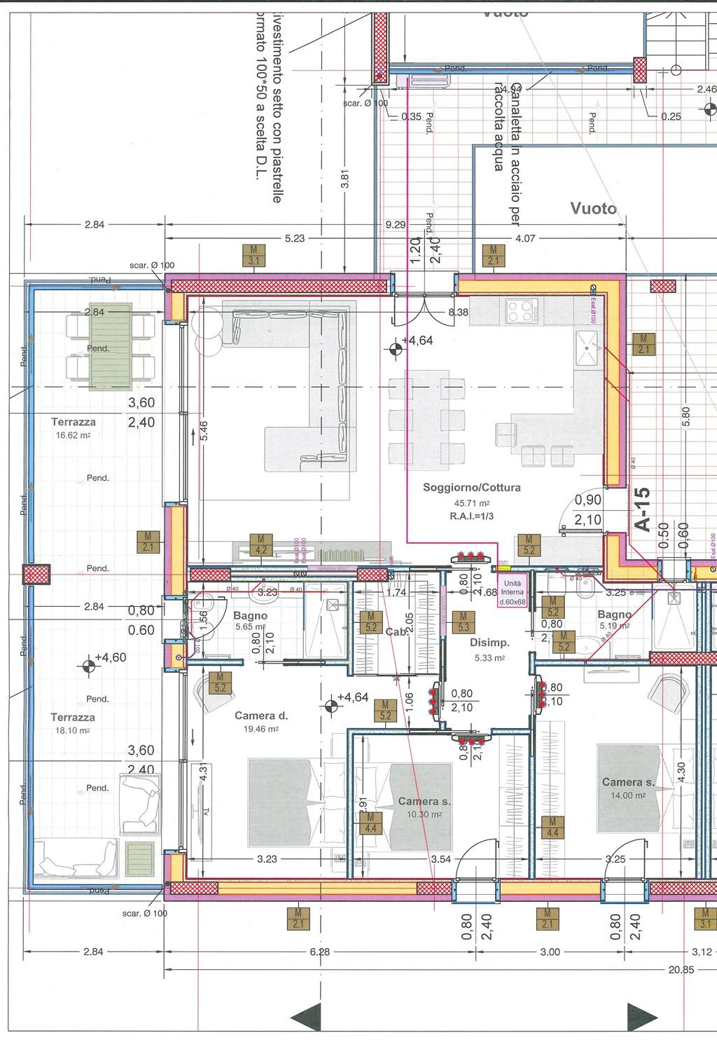 Four-room apartment on the first floor, comprising living room with open kitchen, hallway, bathroom, three double bedrooms, one of which with bathroom and private walk-in closet. The apartment will have a 35 sqm covered terrace and a 12 sqm balcony. The property includes a 46 sqm garage.