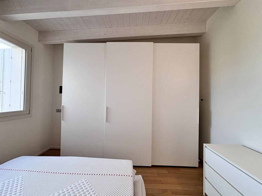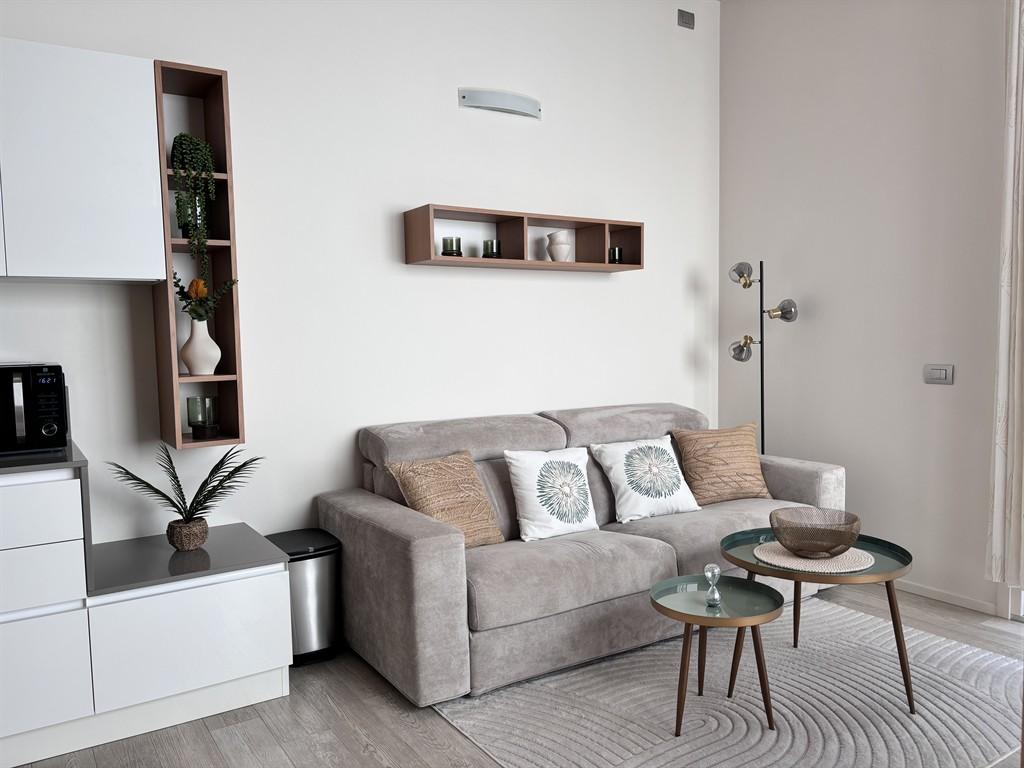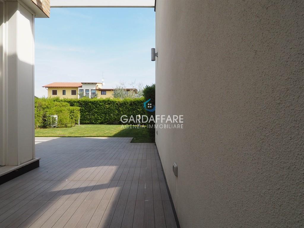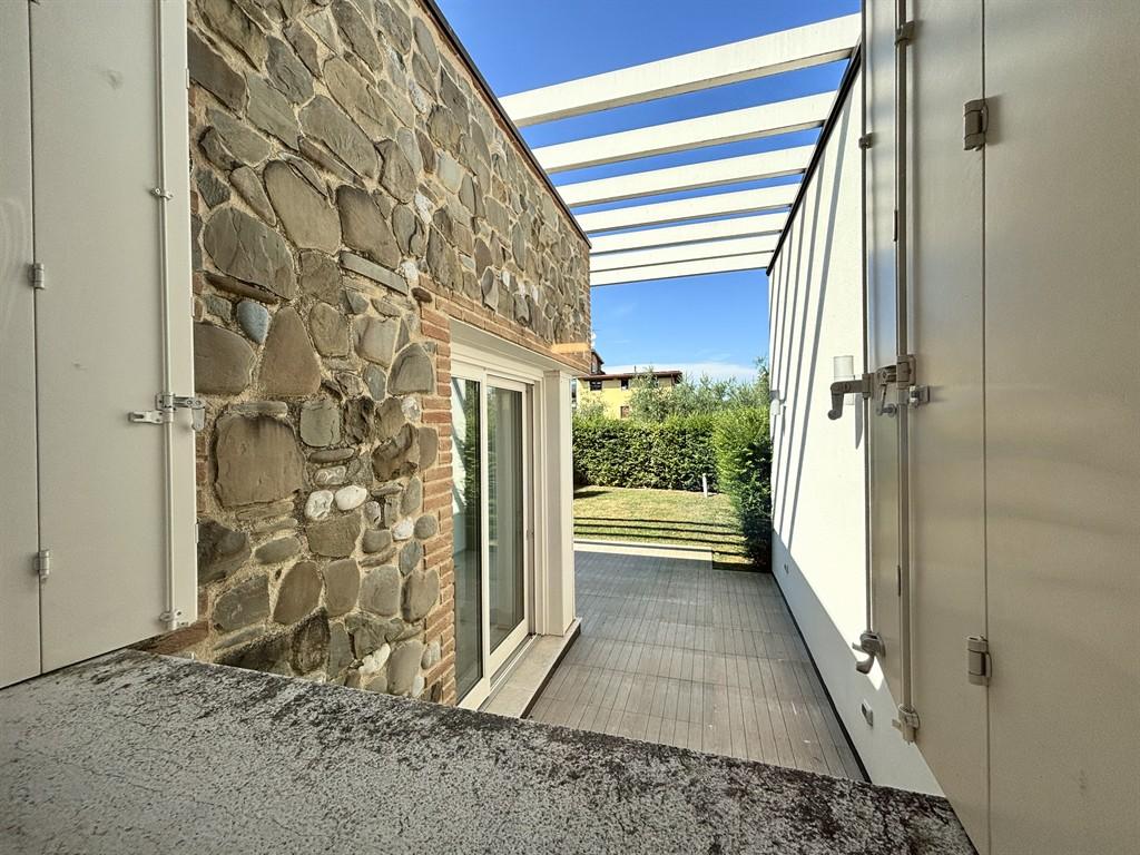 In the hamlet of Rivoltella, in a residential area with a swimming pool, we are selling a three-room villa with independent entrance and private garden. The property consists of an entrance porch, living room with open kitchen, a bathroom with window, a double bedroom, and a single bedroom. The living area is very bright, offering a large opening onto the wooden deck and the garden planted with natural grass. The house is sold fully furnished as seen in the photographs. The heating is centralized/independent underfloor heating, air conditioning, alarm system, safe, security door. The property includes a single garage and a cellar in the basement, as well as two private parking spaces on the street level.