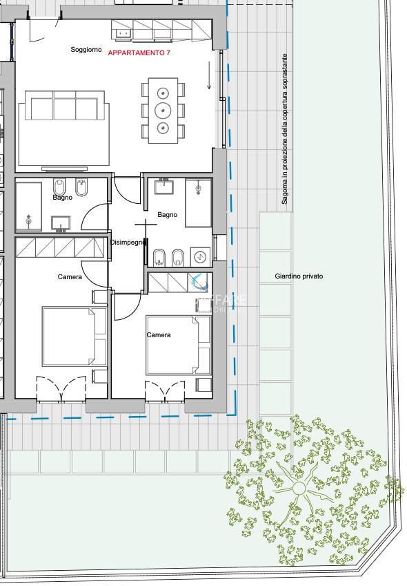 The apartment offered here is a two-bedroom unit with a loggia and private garden.