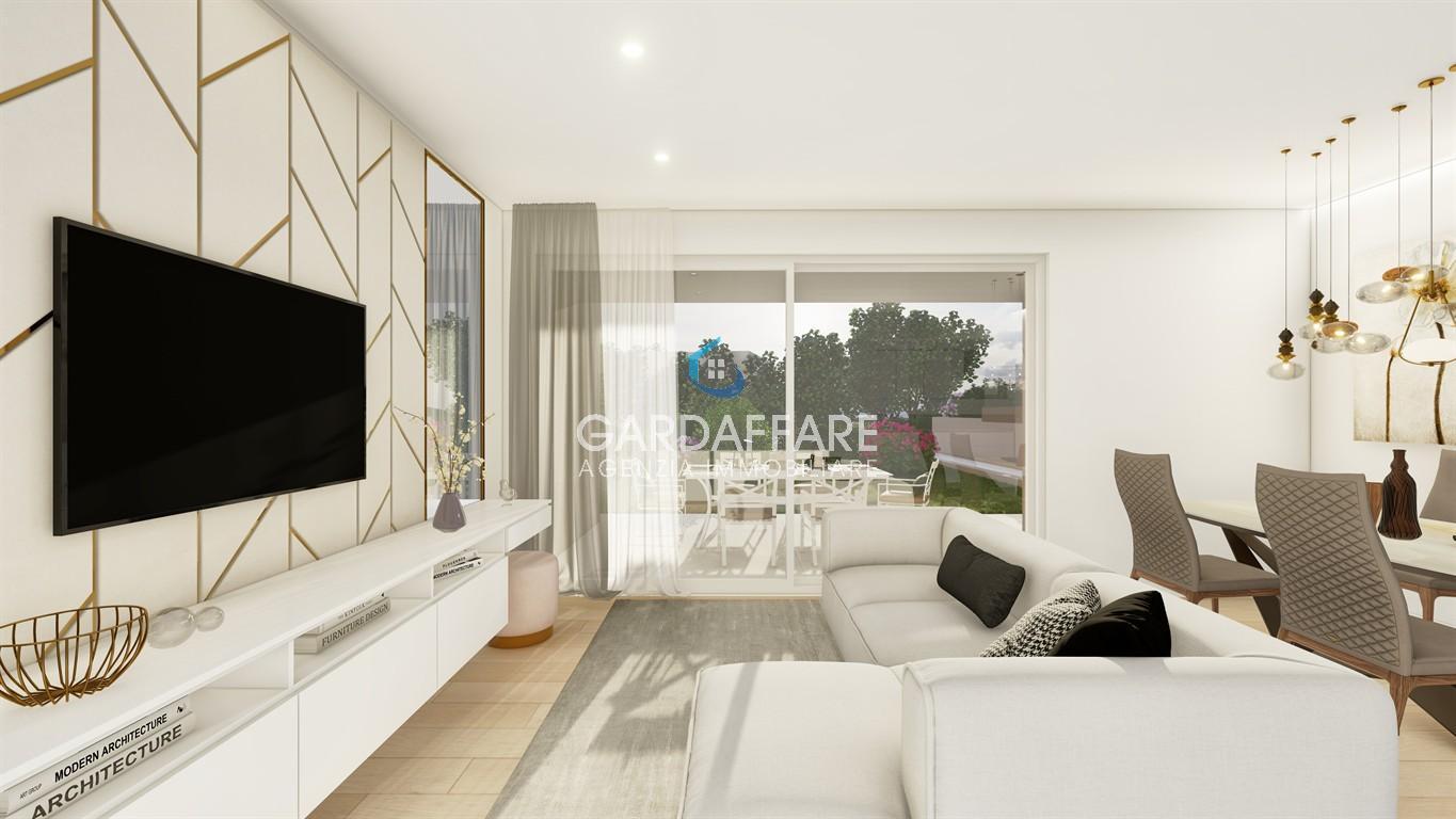 Trilocale al piano terra composto da soggiorno con cucina a vista, disimpegno, due camere ed un bagno. L'appartamento avrà un portico di 16 mq ed un piccolo giardino di proprietà. Completa la proprietà un box auto singolo di 19 mq.