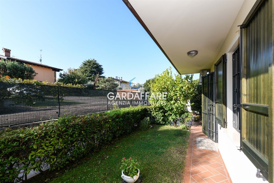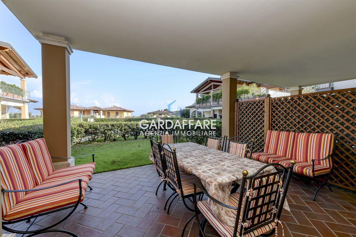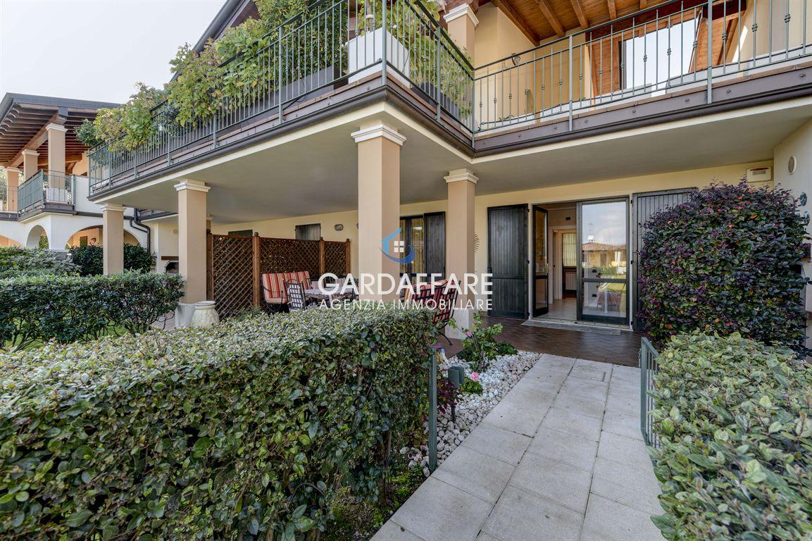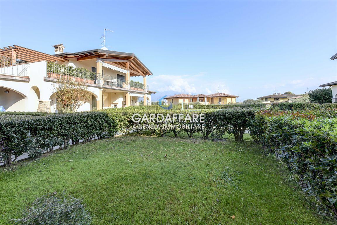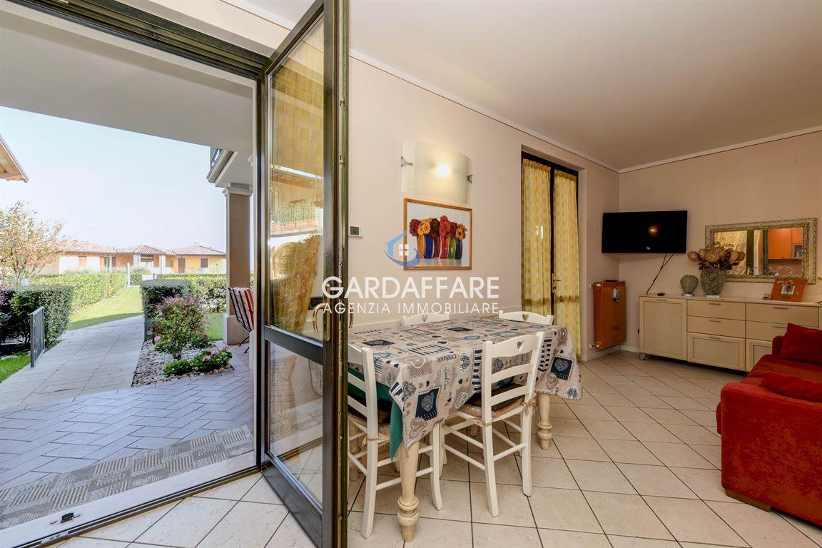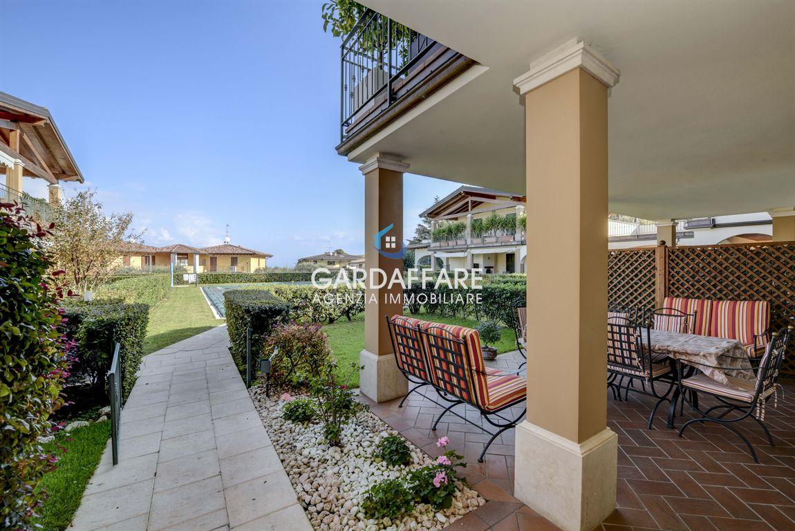 In ottima posizione comoda al lago e al centro, all'interno di esclusivo complesso residenziale di sole 13 unità con bellissima piscina, proponiamo in vendita AMPIO APPARTAMENTO TRILOCALE AL PIANO TERRA CON GIARDINO PRIVATO FRONTE E RETRO E AMPIO PORTICO ESCLUSIVO. L'appartamento è composto da soggiorno con zona cottura, due spaziose camere e bagno. Ampio garage di 23 mq. nell'interrato del complesso e due posti auto di proprietà interni al residence.