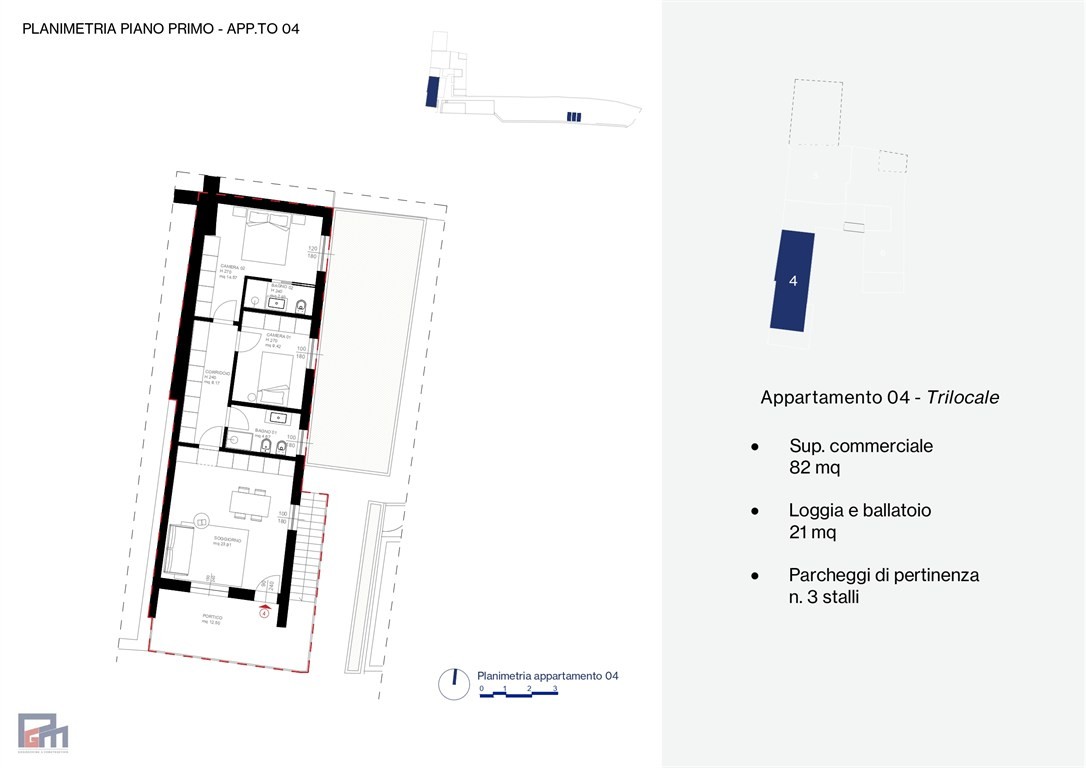 Completano la proprietà tre posti auto scoperti pertinenziali al costo di € 12.500 cada uno.