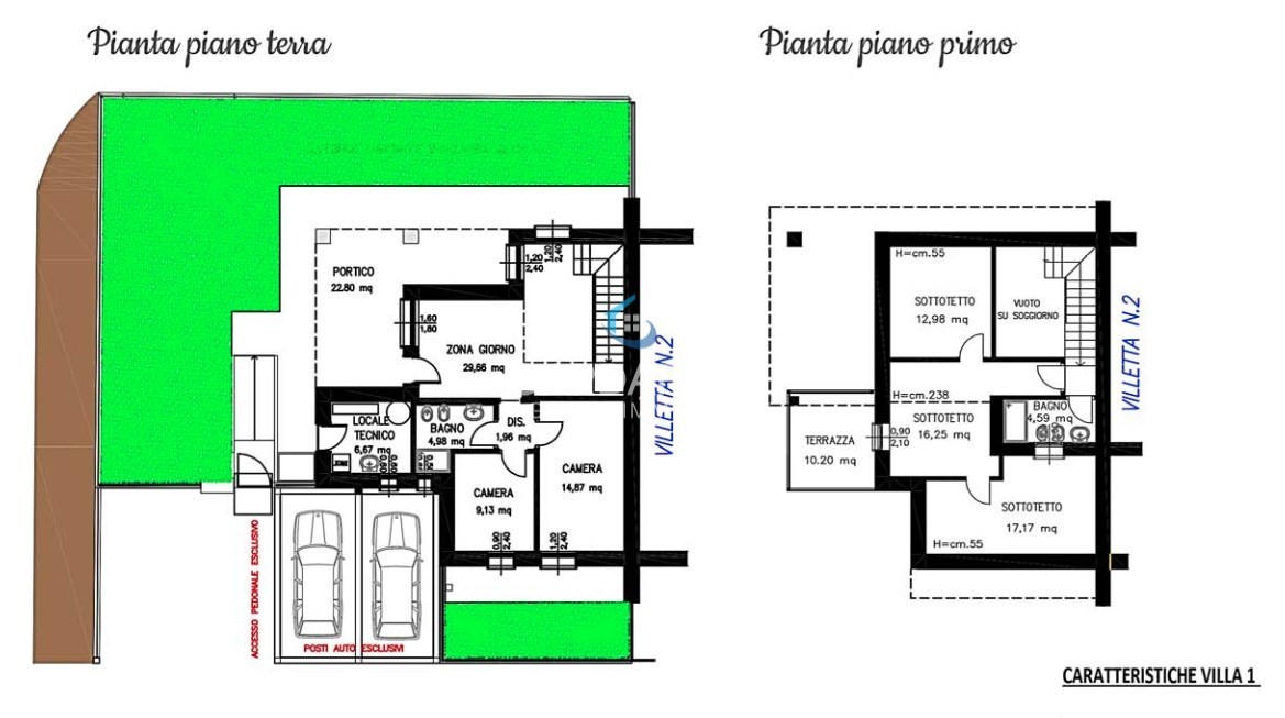 Le ville si sviluppano su due livelli e offrono ambienti luminosi e armoniosi. Al piano terra, la zona giorno con cucina si apre verso l’esterno grazie al portico, creando una naturale continuità tra interni ed esterni. La zona notte comprende due camere da letto, un bagno e spazi funzionali ben organizzati, affiancati da locale tecnico e da un giardino privato che garantisce privacy e vivibilità. Completano il piano due posti auto coperti.